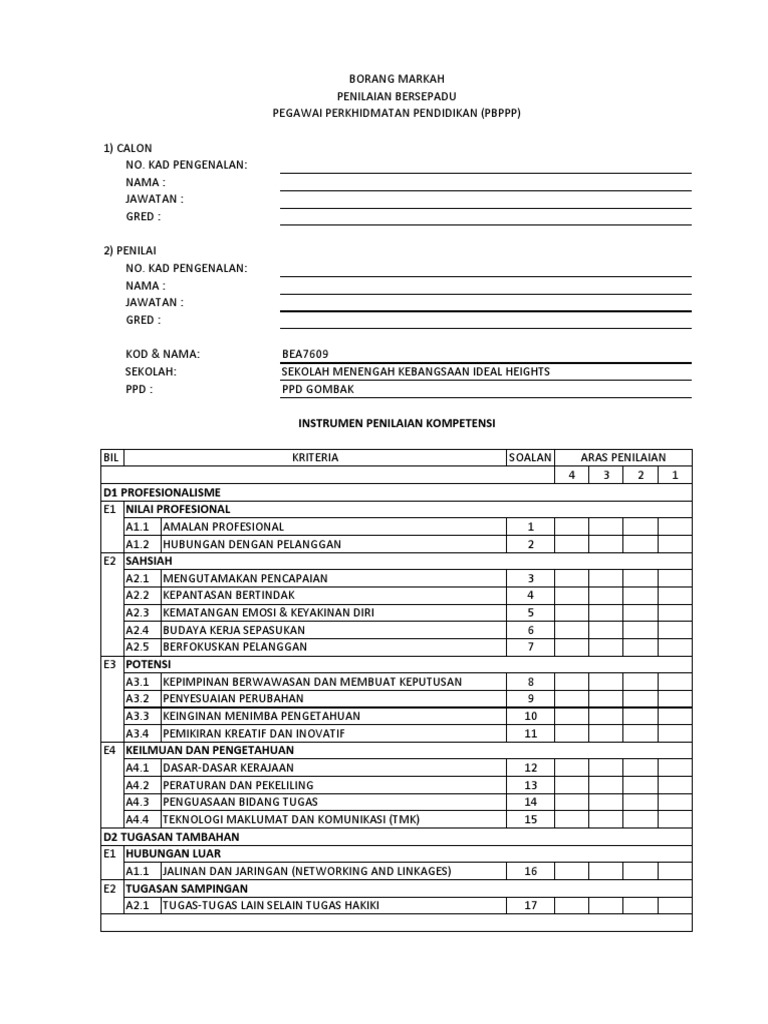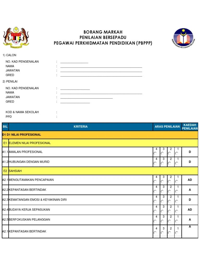 Borang Markah Penilaian Bersepadu Pbppp / Bagi yang ingin mendapatkan maklumat lebih lanjut mengenai pbppp ini, adalah boleh download powerpoint instrumen pbppp dan juga excel penilaian bersepadu pbppp (sm) ini.. Penilaian bersepadu pegawai perkhidmatan pendidikan (pbppp). Borang skor markah penilaian bersepadu pbppp. Borang penilaian kendiri pbppp 2016 1 2 xls xlsx. Mohon pegawai penilai (pp) yang dilantik menyemak serta memastikan senarai pegawai yang dinilai (pyd) di bawah. Berikut kami kongsikan borang keberhasilan guru bimbingan & kaunseling bagi tujuan penilaian bersepadu pegawai perkhidmatan pendidikan 2016 (pbppp).