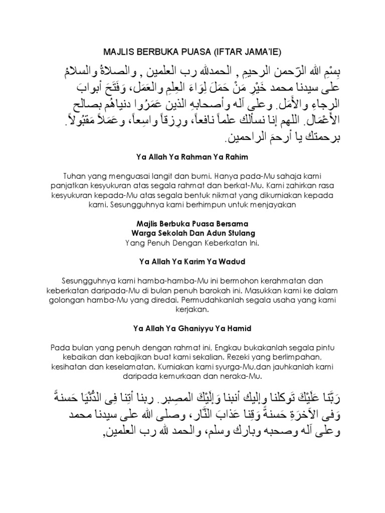 Ya allah kurniakan kami iman yang. Ihya kertas kerja berbuka puasa. Teks pengacara majlis berbuka puasa. Doa berbuka puasa ini ditampilkan dalam tulisan yang sangat lengkap dengan berbagai sudut pandang terhadap banyaknya doa berbuka puasa yang beredar. Salah satu contoh doa berbuka puasa yang pupuler di kalangan masyarakat namun berasal dari hadits yang dha'if (lemah) adalah doa yang berbunyi Terdapat puasa wajib maupun puasa sunnah, contoh puasa wajib adalah puasa di bulan ramadhan, sedangkan contoh puasa sunnah adalah puasa senin kamis, puasa. Rasulullah saw sendiri menjadikan momen ini sebagai wujud rasa. Demikianlah mengenai bacaan niat dan doa berbuka puasa ramadhan. Berikut adalah bacaan doa berbuka puasa ramadhan beserta terjemahnya. Bacaan doa niat puasa ramadan dan doa buka puasa. Tapi doa yang keempat adalah versi yang shahih. Begitulah yang terjadi pada doa berbuka puasa. Doa berbuka puasa tentu saja merupakan hal yang selalu dibacakan oleh semua orang yang berpuasa, khususnya saat berbuka.